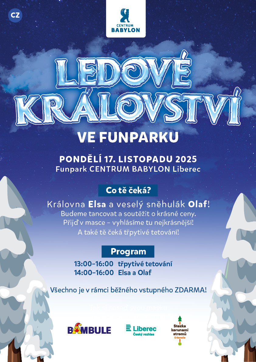 rádi bychom Vás pozvali 17. 11. 2025 do Funparku, který se promění v kouzelnou zimní říši. Do Funparku zavítá královna Elsa a sněhulák Olaf, kteří si s dětmi zazpívají, zatancují a zasoutěží o krásné ceny. Na malé návštěvníky čeká také soutěž o nejkrásnější masku a oblíbené třpytivé tetování.