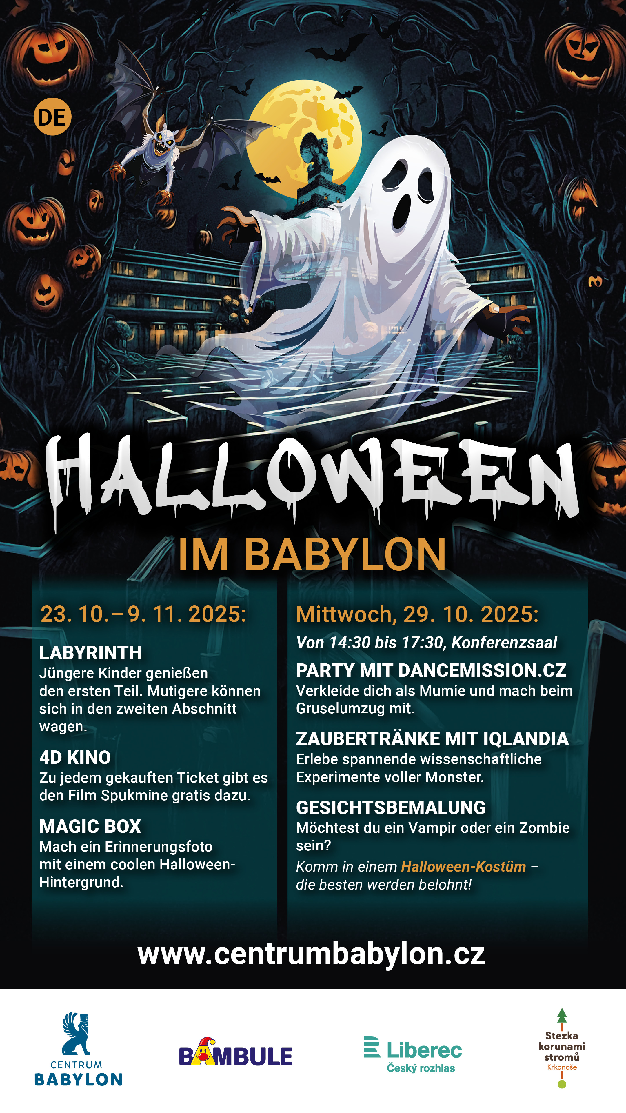 Wir laden alle zu einem gruseligen Halloween-Programm ein. Freut euch auf das gruselige Labyrinth! Im 4D-Kino gibt es den zweiten Film, „Das Geisterhaus“, kostenlos zu sehen. Am 29. 10. findet ab 14:30 Uhr im Konferenzsaal eine Gruselparty statt.